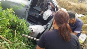 จากการสอบถามศิโรจน์ กมลพรวัฒนา อาสากู้ภัย กล่าวว่า มาถึงที่เกิดเหตุ พบว่าคนเจ็บ นั่งติดอยู่ตรงหน้าพวงมาลัยรถพยายามจะช่วยคนเจ็บออกเพื่อนำส่งโรงพยาบาลแต่ถูกสุนัขเห่าและขู่ไม่ยอมให้เข้าใกล้ จากนั้นพยายาม ไล่สุนัข ให้ออกจาก คนขับใช้เวลากว่า 15 นาทีจึงช่วยคนขับออกมาได้และนำส่งโรงพยาบาล กรุงสยามเซนต์คาร์ลอส และจะช่วยสุนัขออกมาจากรถ แต่น้องไม่ยอมออกทั้งเห่าทั้งเสียงขู่ เลยประสานไปทางญาติผู้ได้รับบาดเจ็บมารับสุนัขออกจากรถ ด้านเจ้าหน้าที่ตำรวจ สภ. เมืองปทุมธานี ตรวจสอบที่เกิดเหตุบันทึกภาพไว้เป็นหลักฐานและจะเรียกคนขับรถมาสอบถามเหตุการณ์ที่เกิดขึ้น ภายหลังและประสานรถยก เพื่อนำรถ ขึ้นจากริมถนนต่อไป