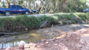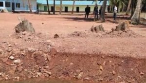 โดยพบป้ายไวนิลขนาดประมาณ 1×2 เมตรปักประกาศระบุว่า “ที่ดินแบ่งขาย” พร้อมมีรูปภาพตีเส้นแบ่งขายเป็น 4 แปลงรวมเต็มทั้งหมดบนที่ดินถมแล้วเสร็จความลึกจากด้านหน้าติดถนน เลยไม้ปักกั้นแนวเขตซึ่งล้ำรุกไปในที่ดินสาธารณะและยังพบอีกว่ามีต้นไม้ใหญ่จำนวน 2 ต้นถูกตัดทิ้ง