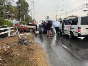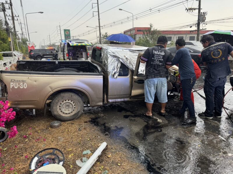 ปทุมธานี – ลุงวัย 58 ปี ขับกระบะเสียหลักชนอัดเสาไฟเหล็กเสียบคาขาคนขับกู้ภัยเร่งตัดถ่างช่วยชีวิต