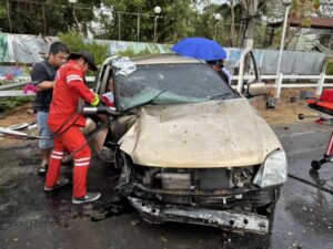 จาการสอบถาม นายธนวัฒน์ บุตรวงค์ กล่าวว่า ได้รับแจ้งเหตุฝนตกถนนรื่นกระบะขับชนเสาไฟส่องสว่างมีผู้ขับขี่ติดอยู่ภายใน 1 คน ตนและทีมมูลนิธิกู้ภัยร่มไทรจึงรีบเข้ามาช่วยเหลือทันที่โดยใช้เครื่องตัดถ่านนำร่างผู้บาดเจ็บออกจากภายในตัวรถ ผู้บาดเจ็บมีแผลฉีกขาดบริเวณตรงน่องขาด้านซ้ายมีเหล็กเสียบคาอยู่และแผลถลอกบริเวณในหน้า จากนำจึงนำตัวส่ง รพ.ซีจีเอช ลำลูกกา เพื่อรักษาอาการบาดเจ็บต่อไป