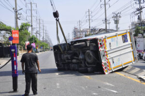 รถบรรทุกตู้ทึบพุ่งเฉี่ยวชน 22 ล้อ พลิกคว่ำกลางถนนปู่เจ้าสมิงพราย