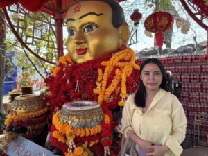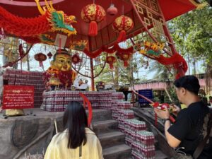 น.ส.นัยน์ณภัค พัฒนฐานิศร์ อายุ 33 ปี ชาว กทม. ที่เดินทางมาพร้อมครอบครัวเพื่อนำ รถมอเตอร์ไซค์ไฟฟ้าสำหรับเด็ก มาถวายแก้บนให้แก่ กุมารทองเจ้าสัวเฮง โดยเล่าว่า เดินทางมาที่นี่เป็นรอบที่ 3 แล้วค่ะ ล่าสุดมาขอพรให้การเทรดหุ้นประสบความสำเร็จ ได้กำไรตามเป้า 5,000 เหรียญ หรือประมาณ 180,000 บาท เมื่อได้สมความปรารถนาจึงรีบซื้อของมาแก้บนตามที่สัญญาไว้