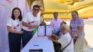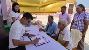 อ่างทอง – ฮือฮาคุณตาวัย67ปีควงแขนคุณยายวัย76ปีจดทะเบียนสมรสวันวาเลนไทน์หน้าองค์หลวงพ่อใหญ่ วัดม่วง หลังอยู่ด้วยกันมากว่า 40 ปี