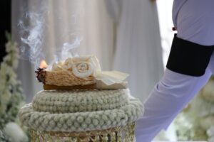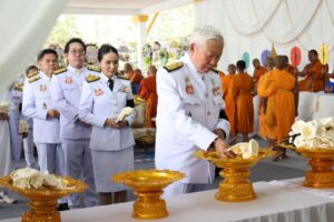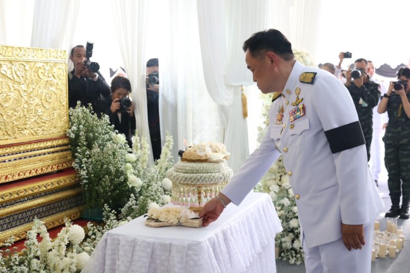 เมื่อนายกรัฐมนตรีเดินทางถึงศาลาบำเพ็ญกุศลศพ ได้ประกอบพิธีทอดผ้าไตรประทาน จำนวน 1 ไตร และผ้าไตรพระราชทาน จำนวน 5 ไตร จากนั้นเจ้าหน้าที่ได้เปิดโคมเพลิงพระราชทาน พร้อมเชิญดอกไม้จันทน์พระราชทานของพระบาทสมเด็จพระเจ้าอยู่หัว และดอกไม้จันทน์ประทานของสมเด็จพระสังฆราช เข้าสู่พิธี โดยนายอนุทินได้ทำความเคารพเบื้องหน้าทิศที่พระบาทสมเด็จพระเจ้าอยู่หัวประทับ ก่อนหยิบดอกไม้จันทน์พระราชทานจุดไฟหลวงจากโคมพระราชทาน วางบนพานรับเพลิง และวางดอกไม้จันทน์ประทานตามลำดับต่อมาพระสงฆ์ คณะรัฐมนตรี ข้าราชการ และผู้เข้าร่วมพิธี ได้ร่วมวางดอกไม้จันทน์เพื่อแสดงความอาลัยเป็นครั้งสุดท้าย