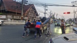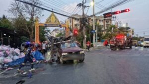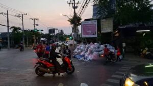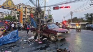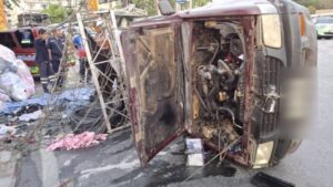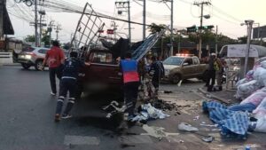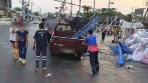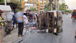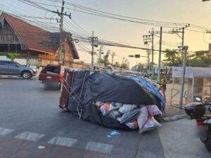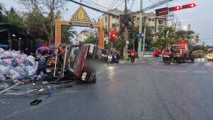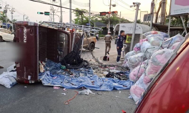 รถกระบะบรรทุกเศษผ้าพลิกคว่ำกลางถนนพุทธบูชา โชคดีไร้ผู้บาดเจ็บ