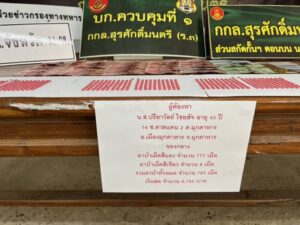 ตามที่ได้รับแจ้งจากแหล่งข่าว่า มีการลักลอบจำหน่ายยาเสพติด(ยาบ้า)ให้กับกลุ่มวัยรุ่นในพื้นที่ อำเอเมืองมุกดาหาร จังหวัดมุกดาหาร สร้างความวิตกกังวลให้กับราษฎรในพื้นที่หวาดกลัวยาเสพติดจะแพร่ระบาดไปสู่บุตรหลานอย่างมาก ชุดปฏิบัติการร่วม ฯ จึงเข้าทำการปิดล้อมตรวจค้นหมู่บ้านเป้าหมาย สามารถจับกุม น.ส.ปรียาวัลย์ ไชยสัจ อายุ 45 ปี บ้านเลขที่ 14 ซอย ตาดแคน 2 ตำบลมุกดาหาร อำเภอเมืองมุกดาหาร จังหวัดมุกดาหาร พร้อม ของกลาง ยาเสพติดให้โทษประเภท 1 (ยาบ้าหรือเมทแอมเฟตามีน) เม็ดสีแดง จำนวน 777 เม็ด และเม็ดสีเขียว จำนวน 8 เม็ด รวมยาบ้าทั้งหมด จำนวน 785 เม็ด และเงินสด จำนวน 9,780 บาท หน่วย ฯ ได้ทำการบันทึกภาพและเสียงอย่างต่อเนื่องในขณะที่จับกุม จนกระทั่งส่งตัวให้พนักงานสอบสวนตาม มาตรา 22 วรรคหนึ่ง แห่ง พ.ร.บ.ป้องกันและปราบปรามการทรมานและการทำให้สูญหาย พ.ศ.2565 หน่วยได้นำตัวผู้ต้องหาพร้อมของกลางส่ง พงส.สภ.เมืองมุกดาหาร เพื่อดำเนินคดีตามกฎหมายต่อไป