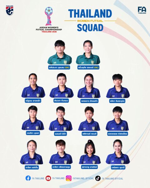 สมาคมกีฬาฟุตบอลแห่งประเทศไทย ในพระบรมราชูปถัมภ์ ประกาศรายชื่อ 14 นักฟุตซอลหญิงทีมชาติไทย ชุดทำการแข่งขันฟุตซอลหญิงชิงแชมป์อาเซียน 2026 (Asean Women’s Futsal Championship 2026) ระหว่างวันที่ 24 กุมภาพันธ์ – 2 มีนาคม 2569 ณ ศูนย์การค้าเทอร์มินอล 21 โคราช จังหวัดนครราชสีมา ภายใต้การคุมทัพของ “โค้ชโอ” ธนาธร สันทนาประสิทธิ์ หัวหน้าผู้ฝึกสอน