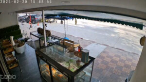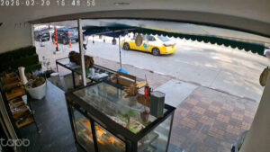 ภาพจากกล้องวงจรปิดร้านค้าข้างทาง จับภาพรถแท็กซี่ ขับตรงมาก่อนจะเป๋มาด้านซ้ายพุ่งชนท้ายรถยนต์อเนกประสงค์ ฟอร์จูนเนอร์ ฝั่งขวา ที่จอดไอยู่ข้างทางจนแท็กซี่หมุนไปจอดขวางอยู่กลางถนน ส่วน รถยนต์อเนกประสงค์ ฟอร์จูนเนอร์ ถูกชนจนรถไหลไปชนรถยนต์แวนที่จอดอยู่ข้างหน้าและล้อหน้าฝั่งซ้ายปีนขึ้นฟุตบาท