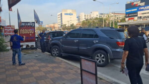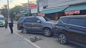 ในที่เกิดเหตุ พบ รถแท็กซี่ โตโยต้า สีเหลือง จอดขวางอยู่กลางถนน สภาพด้านหน้าฝั่งซ้ายพังยับเยิน ใกล้กันที่เลนซ้าย พบ รถยนต์นั่งอเนกประสงค์ โตโยต้า ฟอร์จูนเนอร์ สีดำ จอดอยู่ สภาพล้อหน้าฝั่งซ้ายแตกปีนอยู่บนฟุตบาท ล้อหลังขวามุดเข้าไปหาตัวรถ ที่กันชนหลังขวามีร่องรอยการเฉี่ยวชน และที่กันชนหน้าแตก ที่ด้านหน้า พบ รถยนต์แวน มิซูบิชิ สีดำ สภาพประตูท้ายรถยุบพังยับเยิน โดยในที่เกิด พบ มีผู้ได้รับบาดเจ็บ คือ นางสาวกี้ อายุ 40 ปี ซึ่งเป็นผู้โดยสารที่มากับรถแท็กซี่ มีอาการปวดเจ็บตามร่างกาย เจ้าหน้าที่ให้การช่วยเหลือนำส่งโรงพยาบาล ส่วน โชเฟอร์รถแท็กซี่บาดเจ็บเล็กน้อยที่บริเวณใบหน้า ทราบชื่อ นายโชคทวี อายุ 56 ปี ได้ยืนรอให้การกับเจ้าหน้าที่