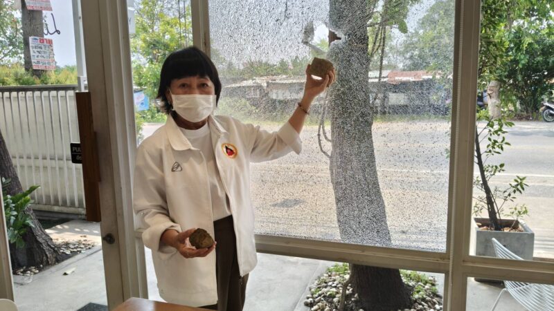 นางรัษมี บุญญะสิทธิ์ อายุ 66 ปี อดีตข้าราชการครูและเจ้าของร้านกาแฟ “ลิตเติ้ล ยู” (Little U) ภายในซอยรังสิต-นครนายก 31 ต.ประชาธิปัตย์ อ.ธัญบุรี พาผู้สื่อข่าวตรวจสอบความเสียหาย พบกระจกนิรภัยหน้าร้านถูกแรงกระแทกจากก้อนหินจนแตกเป็นรอยร้าวขนาดใหญ่ถึง 2 บาน เศษกระจกกระจายเกลื่อนร้าน พร้อมหลักฐานสำคัญเป็นก้อนหินขนาดเท่ากำปั้นที่คนร้ายใช้ก่อเหตุ
