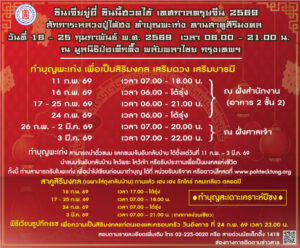 เทศกาลตรุษจีน มูลนิธิป่อเต็กตึ๊ง ประจำปี 2569 กำหนดจัดขึ้น ระหว่างวันที่ 16 – 25 กุมภาพันธ์ พ.ศ. 2569 โดยขอเชิญชวนศิษยานุศิษย์ และสาธุชนทุกท่าน “สักการะหลวงปู่ไต้ฮง” ขอพรเนื่องในเทศกาลตรุษจีนเพื่อความเป็นสิริมงคลต้อนรับปีใหม่ ลงชื่อสวดชัยมงคลคาถา หรือ “พะเก่ง” เพื่อสะเดาะเคราะห์ ขอให้ครอบครัวมีสุข เสริมโชคลาภ เสริมดวงชะตา เสริมความมั่นคงสถาพร ตลอดปี รวมถึงทำบุญสะเดาะเคราะห์และเสริมความเป็นสิริมงคลกับรูปปั้นนักษัตรปีมะเมีย ซึ่งได้ผ่านการทำพิธีเบิกเนตรโดยพระอาจารย์จีนคณาณัติจีนพรต (เย็นงี้) เจ้าอาวาสวัดมังกรกมลาวาส (เล่งเน่ยยี่) พร้อมรับประทาน สาคูสิริมงคล เพื่อความกลมเกลียวและอยู่เย็นเป็นสุข รับฮู้ (ยันต์) ของหลวงปู่ไต้ฮง ติดหน้าบ้าน หรือพกติดตัวเพื่อคุ้มครอง เคาะระฆังทอง ให้ก้องกังวานเพื่อให้ชีวิตสดใส การงานรุ่งเรืองระบือไกล และร่วมขอพรเทพยดาฟ้าดินเนื่องในวันประสูติ (ทีกงแซ) ซึ่งในปีนี้ตรงกับวันอังคารที่ 24 กุมภาพันธ์ 2569 ขออำนาจฟ้าดินเป็นที่พึ่ง ขอให้สิ่งศักดิ์สิทธิ์ที่ตนนับถือ เช่น หลวงปู่ไต้ฮง ช่วยดลบันดาลให้ประสบโชคดีตลอดปีใหม่ (โดยในวันที่ 24 กุมภาพันธ์ 2569 มูลนิธิป่อเต็กตึ๊ง เปิดบริการโต้รุ่ง ให้แก่ผู้มีจิตศรัทธาได้เข้าสักการะ ทำบุญตลอดคืน)