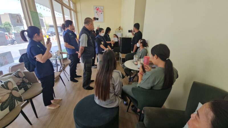 คลินิกดังกล่าว เป็นอาคารชั้นเดียว ภายในตกแต่งแบ่งเป็นห้องต่างๆ ด้านหน้าเป็นเคาน์เตอร์และห้องรองรับลูกค้า เข้าไปข้างในแบ่งเป็น 4 ห้อง มีห้องแนะนำการรักษา 1 ห้อง และห้องเสริมความงามและฉีดโบทอก 3 ห้อง โดยเจ้าหน้าที่เข้าตรวจสอบพบมีบุคคลแต่งชุดสีเขียว 4 คน และชุดสีเทา 1 คน ประกอบด้วย นางสาวอัญชลี สุขจร อายุ 51 ปี นางสาวอรทิตา สีอุตตะ อายุ 33 ปี นางสาวเตชินี ขุนอาจ อายุ 38 ปี นายดนุภา เชยรัมย์ อายุ 36 ปี และ นางสาวภัทรานิษฐ์ เห็มวิพัฒน์ อายุ 45 ปี ก่อนควบคุมตัวมาสอบสวนในเบื้องต้น