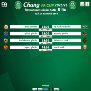 ฟุตบอลถ้วย “ช้าง เอฟเอ คัพ” ฤดูกาล 2025/26 เข้าโค้งสุดท้าย เตรียมระเบิดศึกรอบก่อนรองชนะเลิศ