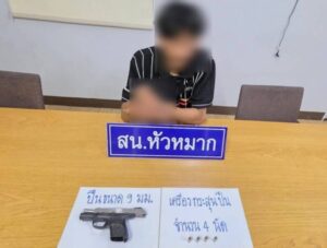 ตำรวจ สน.หัวหมาก จับหนุ่มวัย 23 พกปืน 9 มม. ยิงขึ้นฟ้าหลังทะเลาะวิวาท ซุกอาวุธในถังข้าวสารหลังร้านกัญชา