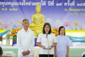นางสุดา หลงราม ครูโรงเรียนต้นหยงมัส อำเภอระแงะ จังหวัดนราธิวาส กล่าวว่า ในนามตัวแทนคณะครู ขอเปิดใจถึงสถานการณ์ความเป็นอยู่ของครูที่ต้องไปปฏิบัติหน้าที่ในพื้นที่เสี่ยงภัย ซึ่งเป็นบริบทของการทำงานที่ท้าทาย ทั้งด้านความปลอดภัย ความกดดันทางจิตใจ และข้อจำกัดด้านทรัพยากรในพื้นที่ ครูจำเป็นต้องมีความเข้มแข็ง อดทน และมีสติในการเผชิญปัญหารอบด้าน ขณะเดียวกันยังต้องทำหน้าที่ถ่ายทอดความรู้ ดูแล และเป็นที่พึ่งทางใจให้แก่นักเรียนและชุมชน แม้สภาพแวดล้อมจะไม่เอื้ออำนวย แต่มโนปณิธานความเป็นครูยังยึดมั่นในอุดมการณ์ อันเป็นรากฐานของการเปลี่ยนแปลง และเป็นแสงสว่างที่ช่วยเปิดโอกาสและความหวังให้กับเด็กและเยาวชน ครูจึงปฏิบัติหน้าที่ด้วยหัวใจแห่งความเมตตาและความรับผิดชอบ แม้ต้องอยู่ในพื้นที่เสี่ยงภัย พร้อมกันนี้ขอกราบขอบคุณหลวงพ่อธัมมชโย และกัลยาณมิตรวัดพระธรรมกายทั่วโลก ที่ได้มอบกองทุนหนุนแรงใจและกำลังใจอันทรงคุณค่านี้ ซึ่งเป็นพลังสำคัญที่ช่วยให้พวกเราครูสามารถยืนหยัดปฏิบัติหน้าที่เพื่ออนาคตของชาติได้อย่างมั่นคง