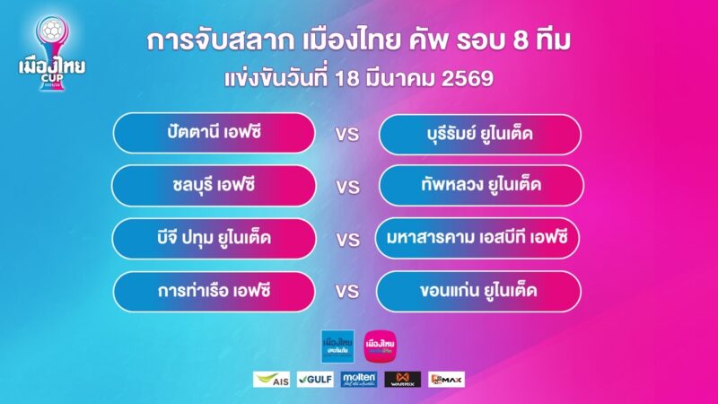 วันที่ 26 กุมภาพันธ์ 2569 เวลา 14.00 น. ณ. ห้องประชุมเมืองไทยประกันภัย อาคารเมืองไทยภัทร คอมเพล็กซ์ “Tower A” ชั้น 14 สมาคมกีฬาฟุตบอลแห่งประเทศไทยฯ จัดพิธีจับสลากประกบคู่การแข่งขันฟุตบอล เมืองไทย คัพ ฤดูกาล 2025/26 รอบ 8 ทีม