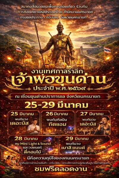 จังหวัดนครนายกเตรียมจัดงานยิ่งใหญ่ครั้งแรกของประวัติศาสตร์ท้องถิ่น “งานรำลึกเจ้าพ่อขุนด่าน” ประจำปี 2569 ระหว่างวันที่ 25–29 มีนาคม 2569 ณ บริเวณศาลเจ้าพ่อขุนด่าน เขื่อนขุนด่านปราการชล และลานท้ายเขื่อนขุนด่านปราการชล จังหวัดนครนายก เพื่อเทิดทูนวีรกรรมและสืบสานตำนานของ เจ้าพ่อขุนด่าน (ขุนหาญพิทักษ์ไพรวัน) ผู้พิทักษ์ผืนป่าและเมืองด่านด้านตะวันออกอย่างกล้าหาญ