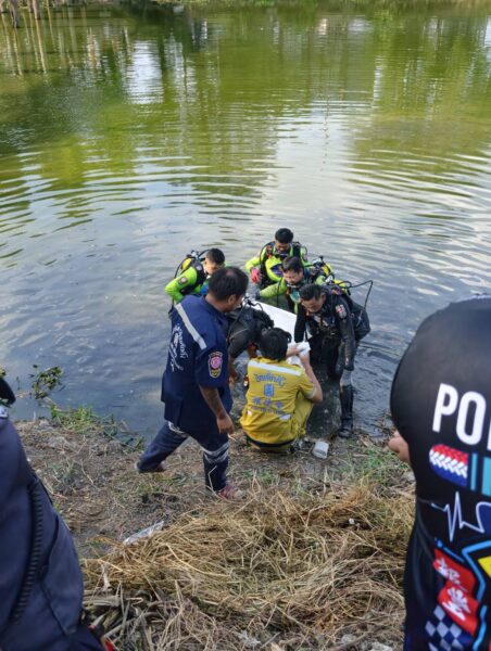 ที่เกิดเหตุมีประชาชนมุงดูเหตุการณ์อยู่เป็นจำนวนมาก เจ้าหน้าที่ชุดประดาน้ำมูลนิธิป่อเต็กตึ๊งจึงรีบลงพื้นที่งมค้นหาภายในคลอง โดยใช้เวลาประมาณ 30 นาที จึงพบร่างผู้เสียชีวิตจมอยู่ก้นคลอง สภาพศพสวมกางเกงขายาวเพียงตัวเดียว ไม่สวมเสื้อ ทราบชื่อคือ นาย SAI SITHU CHAN NYEIN สัญชาติเมียนมา อายุ 31 ปี