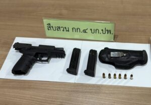 จากการเข้าตรวจค้นห้องพักโดยความยินยอมของผู้ต้องหา เจ้าหน้าที่พบของกลางซุกซ่อนอยู่ในเกะหัวนอนด้านซ้าย ประกอบด้วย: ปืนกึ่งอัตโนมัติ SIG SAUER ขนาด 9 มม. จำนวน 1 กระบอก,ซองกระสุนปืน(Magazine) จำนวน 2 ซอง,เครื่องกระสุนปืนขนาด 9 มม. จำนวน 6 นัด,ซองพกปืน จำนวน 1 อัน