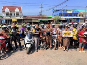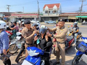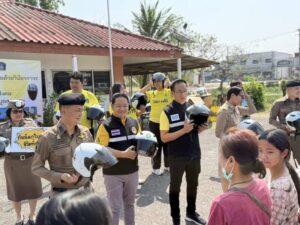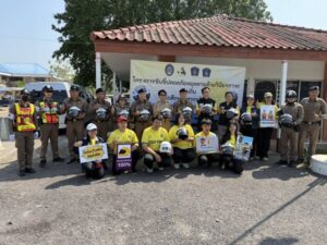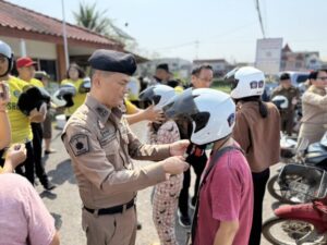 พ.ต.อ.พิเชฐพงศ์ ธนาบูรณศักดิ์ รอง ผบก.ภ.จว.พิษณุโลก พร้อมด้วย พ.ต.อ.เอกภพ พรมราช ผกก.สภ.เนินมะปราง พ.ต.ท.หญิงเพชรสมัย อยู่เล่ห์ สว.ฝอ.ภ.จว.พิษณุโลก เข้าร่วมแจกหมวกนิรภัย ในโครงการ “ ถนนปลอดภัยหยุดตายด้วยวินัยจราจร”