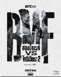 สำหรับการต่อสู้ภายใต้รายการ UFC 326 : HOLLOWAY VS OLIVEIRA 2 จะระเบิดศึก ณ สังเวียน T-Mobile Arena, ลาส เวกัส ,สหรัฐอเมริกา วันอาทิตย์ที่ 8 มีนาคมนี้ คู่หลักของรายการเริ่มเวลา 09.00 น. ตามเวลาประเทศไทย