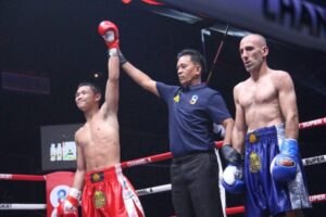 – คู่ที่ 2 มวยไทยพิกัด 53 ก.ก.( 3 ยก ) โมฮัมหมัด กำปั้นอิหร่านชกไตล์บู๊ดุดันชนะคะแนน ซายน์ นักชกเมียนมาร์