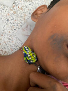 ที่บริเวณหน้าตึก 33 พบ เด็กชาย อายุ 12 ปี นอนรอความช่วยเหลืออยู่บนที่นั่งหินอ่อน โดยมีกบยางหรือเหยื่อปลอมสำหรับตกเบ็ด ติดคาอยู่ที่ลำคอ จากการตรวจสอบพบว่าไม่สามารถนำออกด้วยมือเปล่าได้ เนื่องจากตัวเบ็ดฝังติดใต้ผิวหนัง เจ้าหน้าที่มูลนิธิให้การช่วยเหลือปฐมพยาบาลเบื้องต้นก่อนนำส่งโรงพยาบาล เพื่อให้แพทย์ทำการตรวจและนำเบ็ดออกจากคอได้อย่างปลอดภัย