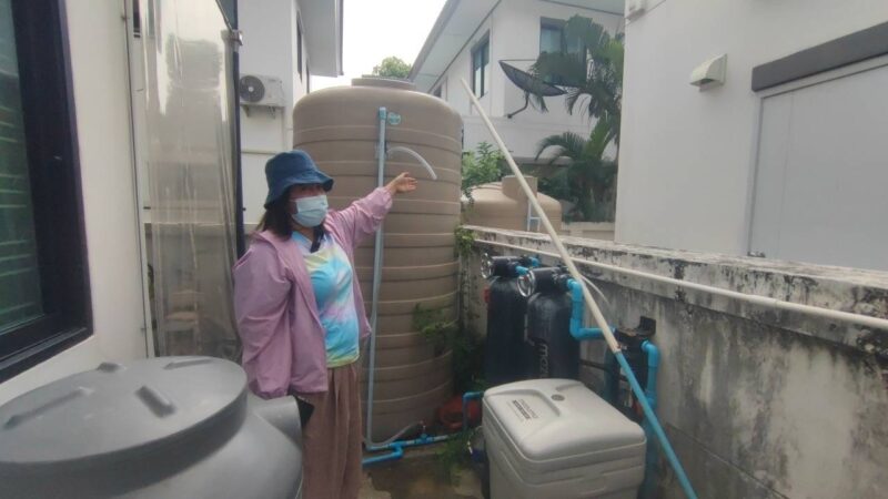 นางสาวศิรินญา มาลากุล อายุ 40 ปี หนึ่งในผู้ได้รับผลกระทบ นำผู้สื่อข่าวตรวจสอบแท็งก์น้ำหลังบ้าน พบว่าแรงดันน้ำไม่เพียงพอที่จะส่งน้ำขึ้นไปยังระบบลูกลอย ทำให้น้ำไม่ไหลเข้าถังสำรอง แม้จะต่อก๊อกน้ำสำรองด้านล่างหวังรองน้ำใส่กะละมังไว้ประทังชีวิตแต่น้ำก็ยังไม่ไหล ดิฉันเข้ามาอยู่ตั้งแต่ปี 2561 ก็เจอปัญหานี้มาตลอด ไม่แน่ใจว่าเกิดจากการขยายตัวของหมู่บ้านจนท่อประปาเล็กไปหรือไม่ นอกจากน้ำไม่ไหลแล้ว บางครั้งยังมีสีเหลืองและมีกลิ่นเหม็น เคยสอบถามไปทางการประปา ก็เป็นการแก้ปัญหาแบบวันต่อวัน แต่อยากให้มีการแก้ไขที่ถูกจุดและยั่งยืนกว่านี้