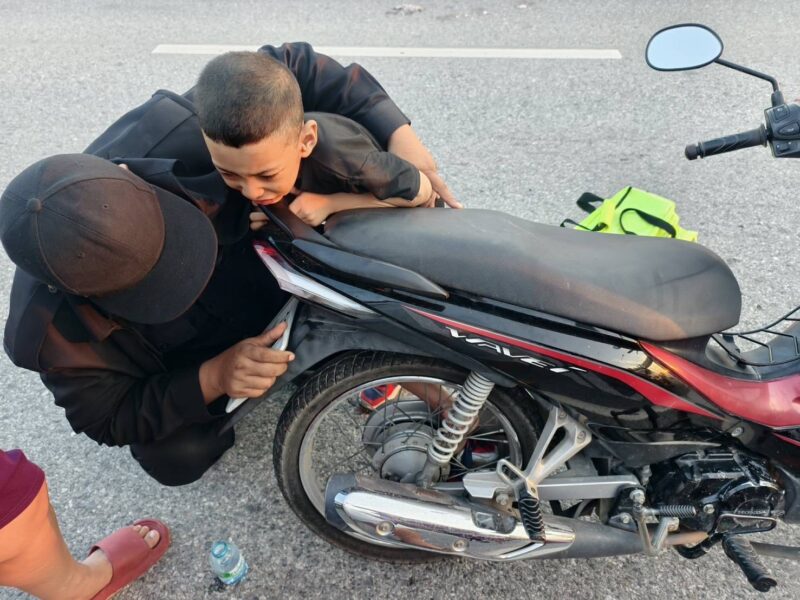 เมื่อเจ้าหน้าที่เดินทางไปถึงที่เกิดเหตุ พบรถจักรยานยนต์ ฮอนด้า เวฟ สีดำ ทะเบียน 1กญ 8376 พัทลุง จอดอยู่บริเวณข้างทาง บนตัวรถพบเด็กชายอายุประมาณ 5 ขวบ ขาซ้ายท่อนล่างติดคาอยู่กับซี่ล้อรถจักรยานยนต์ อยู่ในอาการตกใจร้องไห้ด้วยความเจ็บปวด โดยมีพ่อและแม่ของเด็กยืนคอยปลอบขวัญอยู่ใกล้ ๆ