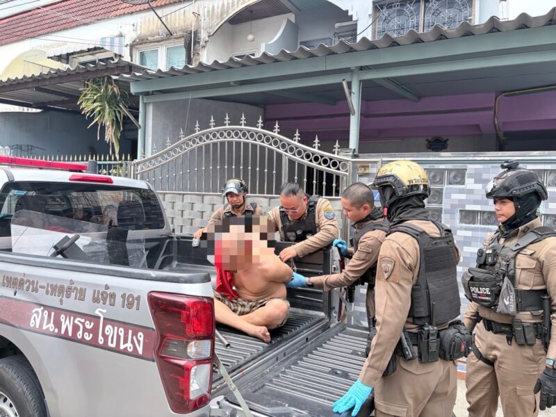 วันที่ 12 มี.ค.2569 เวลาประมาณ 11.20 น. เจ้าหน้าที่ตำรวจชุดจับกุม พร้อมเจ้าหน้าที่ชุดปฏิบัติการพิเศษ กองบังคับการตำรวจนครบาล 5 และสายตรวจ สน.พระโขนง รับแจ้งจากศูนย์วิทยุ สน.พระโขนง ว่ามีชายมีอาการคล้ายมึนเมา ส่งเสียงเอะอะโวยวายและอาละวาดภายในบ้านพัก หมู่บ้านไทยวันดี ซ.วชิรธรรมสาธิต 57 แยก 20 แขวงบางจาก เขตพระโขนง กรุงเทพฯ จึงเดินทางไปตรวจสอบ