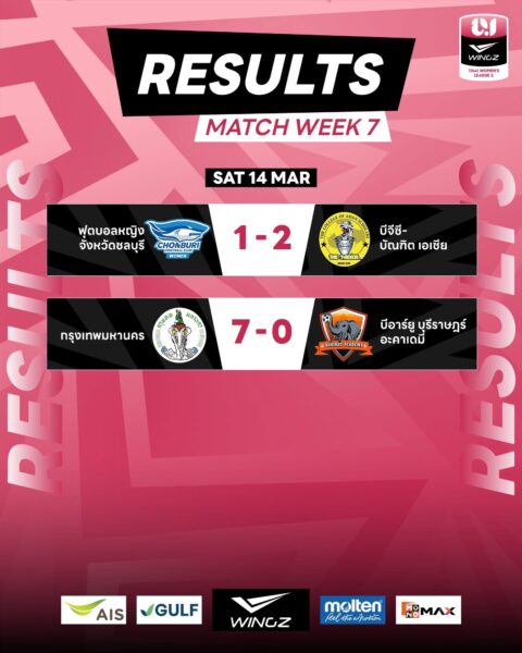 โดยผลฟุตบอล วิงซ์ ไทยวีเมนส์ลีก 1 ฤดูกาล 2026 แมตช์เดย์ที่ 7 ประจำวันเสาร์ที่ 14 มีนาคม 2569