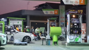 ค่ำแล้ว ประชาชนยังคงนำรถยนต์และรถจักรยานยนต์มาเติมน้ำมัน คิวยาวออกมานอกปั๊ม