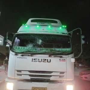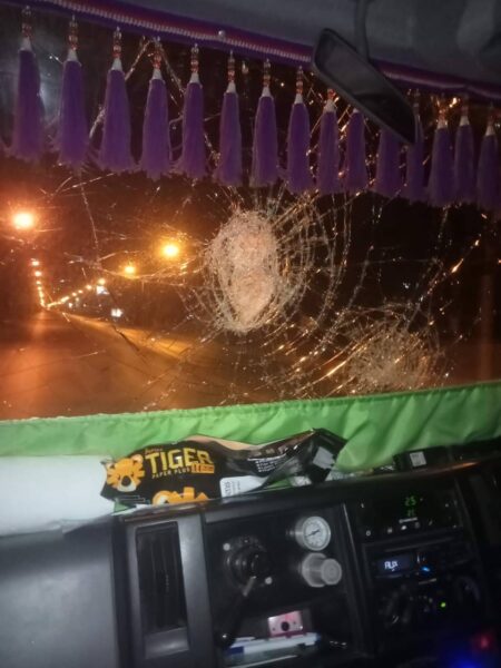 ปทุมธานี – แก๊งกระบะรุมปาหินใส่รถสิบล้อกระจกแตกยับแค่แค้นถูกบีบแตรเตือนขับตัดหน้า