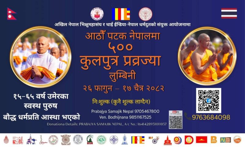 โครงการบรรพชาสามเณร 500 รูป เริ่มตั้งแต่วันที่ 10 มีนาคม ถึงวันที่ 30 มีนาคม 2569 และมีพิธีบรรพชาอย่างเป็นทางการเมื่อวันที่ 16 มีนาคม 2569 โดยพิธีดังกล่าวมี พระครูพิศาลธรรมโสภณ ประธานคณะกรรมการสงฆ์เนปาล พร้อมคณะสงฆ์เนปาลร่วมประกอบพิธีอย่างพร้อมเพรียง การบรรพชาครั้งนี้นับเป็นกิจกรรมสำคัญในการส่งเสริมและฟื้นฟูพระพุทธศาสนาในประเทศเนปาล มุ่งเน้นการสร้างศาสนทายาทรุ่นใหม่ในดินแดนต้นกำเนิดพระพุทธศาสนา