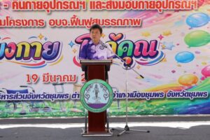 วันนี้ (19 มีนาคม 2569) เวลา 10.00 น. นายเธียรชัย ชูกิตติวิบูลย์ ผู้ว่าราชการจังหวัดชุมพร เป็นประธานในพิธีเปิดศูนย์ยืม – คืน กายอุปกรณ์ฯ และส่งมอบกายอุปกรณ์ฯ ตามโครงการ อบจ.ฟื้นฟูสมรรถภาพ เคียงกาย ใกล้คุณ พร้อมด้วย หัวหน้าส่วนราชการ ผู้บริหารองค์กรปกครองส่วนท้องถิ่น ประธานสภาองค์การบริหารส่วนจังหวัดชุมพร สมาชิกสภาองค์การบริหารส่วนจังหวัดชุมพร คณะกรรมการกองทุนฟื้นฟูสมรรถภาพจังหวัดชุมพร ผู้บริหารโรงพยาบาลส่งเสริมสุขภาพตำบล ข้าราชการ เจ้าหน้าที่ หน่วยงานที่เกี่ยวข้อง ผู้ปกครองของผู้มีสิทธิ์ได้รับการฟื้นฟูสมรรถภาพ และประชาชน เข้าร่วมโครงการฯ ณ ท่าเทียบเรือองค์การบริหารส่วนจังหวัดชุมพร ตำบลท่ายาง อำเภอเมืองชุมพร จังหวัดชุมพร