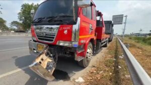 ห่างออกไปประมาณ 200 เมตร พบรถบรรทุก 6 ล้อ (รถหัวลาก) สีแดง หมายเลข ทะเบียน 68 – 2840 กรุงเทพมหานครที่กำลังลากรถบัส จอดอยู่ สภาพกันชนหน้าด้านซ้ายพังเสียหาย