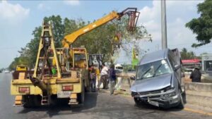สลด ! กระบะพาครอบครัวกลับจากเยี่ยมญาติ แซงไม่พ้น ชนรถหัวลากเสยแบริเออร์เกาะกลาง แม่ยายกระเด็น ดับ 1 เจ็บ 7บนถนนสายเอเชีย