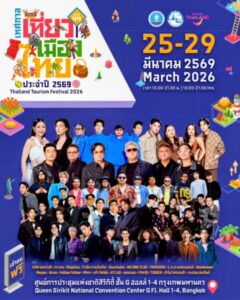 ททท. ขอเชิญชวนนักท่องเที่ยวและประชาชนร่วมสัมผัสประสบการณ์เที่ยวไทยในมุมมองใหม่ เข้าร่วมงานฟรี ระหว่างวันที่ 25–29 มีนาคม 2569 ณ ศูนย์การประชุมแห่งชาติสิริกิติ์ โดยสามารถเดินทางสะดวกด้วยรถไฟฟ้า MRT สถานีศูนย์การประชุมแห่งชาติสิริกิติ์ หรือสอบถามรายละเอียดเพิ่มเติมได้ที่ TAT Contact Center โทร. 1672