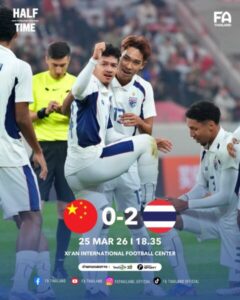 วันที่ 25 มีนาคม 2569 เวลา 18.35 น. ตามเวลาประเทศไทย ณ ซีอาน อินเตอร์เนชั่นแนล ฟุตบอล เซนเตอร์ สาธารณรัฐประชาชนจีน การแข่งขันฟุตบอลอุ่นเครื่องรายการ CFA Team China International Youth Tournament Xi’an นัดแรก ฟุตบอลชายทีมชาติไทย รุ่นอายุไม่เกิน 23 ปี ลงสนามพบกับ จีน รุ่นอายุไม่เกิน 23 ปี