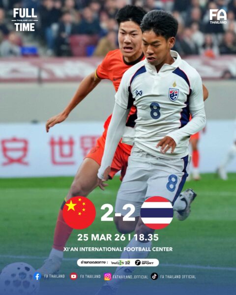ทีมชาติไทย U23 เสมอ จีน U23 2-2 ประเดิมศึก CFA Youth Tournament Xi’an