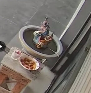จากการตรวจสอบภาพจากกล้องวงจรปิด เป็นรถจักรยานยนต์ยี่ห้อ ฮอนด้า รุ่น เวฟ มีตะกร้าหน้ารถ ไม่ทราบสีและทะเบียนเนื่องจากมองไม่ค่อยชัดขับมาจากปากซอยวัดแหลมฟ้าผ่าผ่านหน้าอาคารพาณิชย์ที่ตนอยู่ไป ก่อนที่จะวกกลับมาจอดบริเวณท้ายรถยนต์กระบะของตนที่จอดหน้าบ้านโดยจอดอยู่สักครู่ใหญ่เหมือนมองหาสิ่งของ ก่อนที่คนขี่รถจักรยานยนต์จะเดินลงมาหยิบอ่างน้ำที่มีรูปปั้นพญานาคตั้งอยู่ขนาดความกว้าง 60 ซม.ออกไป ก่อนที่จะเทน้ำในอ่างที่มีปลาหางนกยูงอยู่ทิ้งลงพื้นด้านหลังรถของตนแล้วส่งให้เพื่อนที่นั่งค่อมรถอยู่รับไว้ หลังจากนั้นได้ขี่รถจักรยานยนต์หลบหนีไปทั้งคู่