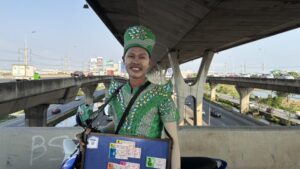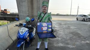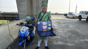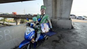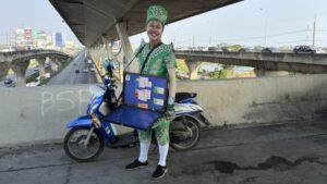 ระหว่างที่ทีมข่าวเราตระเวนข่าวอยู่ในพื้นที่ของอำเภอบางพลี หันไปสังเกตเห็นพ่อค้าหวยลอตเตอรี่ชายท่านหนึ่ง ที่แปลกตาว่าพ่อค้าหวยทั่วไป คือพบว่า พ่อค้ารายนี้ มีการแต่งทรงองค์เครื่องแบบจัดเต็มมาในรูปแบบของชุดลิเกสะดุดตา จนนักข่าวเราอดใจไม่ได้ที่จะต้องจอดรถขอสัมภาษณ์พูดคุยกับพ่อค้ารายนี้