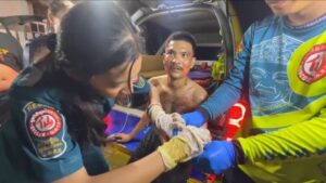 นาย นาวิน ทำนิ อายุ 26 ปี ( เสื้อดำ ) ชาวตำบลสามเรือน อำเภอบางปะอิน จังหวัดพระนครศรีอยุธยา ถูกกระสุนปืนเฉี่ยวบริเวณหน้าท้องด้านขวา 1 แผล