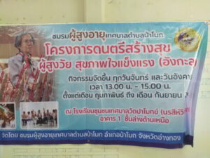 จากการสอบถาม นาง มณฑา รักษพันธุ์ อายุ 70 ปี ประธานชมรมผู้สูงอายุเทศบาลป่าโมก เล่าให้ฟังว่า หลังจากตั้งชมผู้สูงอายุได้ประมาณ 1 ปี จึงมีแนวคิดเพิ่มเติมจาการประชุมพูดคุย ไหว้พระสวดมนต์ เชิญวิทยกรมาพูดคุยเรื่องสุขภาพ และออกกำลังกาย จึงได้มาเล่นดนตรี โดยจัดโครงการดนตรีสร้างสุข ผู้สูงวัย สุขภาพใจแข็งแรง (อังกะลุง) เพื่อฝึกสมาธิ ความจำ และลดความเสี่ยงโรคอัลไซเมอร์ เพื่อส่งเสริมให้ผู้สูงอายุได้บริหารกล้ามเนื้อแขนและข้อมือ เสริมสร้างสมาธิ ฝึกความจำ เพื่อลดความเสี่ยงจากโรคอัลไซเมอร์ สร้างความสุขสนุกสนานต่อไป