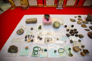 โดยในพิธีการส่งมอบ ได้มีการนำซากเรือโบราณ อายุไม่น้อยกว่า 1,200 ปี และของที่เป็นวัตถุสืบค้นทางประวัติศาสตร์ที่สำคัญหลายชิ้น อาทิ เศษกระเบื้อง เครื่องดินเผา เครื่องใช้ กระดูกสัตว์ โดยปรากฏเป็นของเก่าแก่ที่มีมาจากทั้ง ประเทศอินเดีย จีน และทางอาหรับ ซึ่งอยู่ในช่วงยุคอาณาจักรทวารวดี ที่จมอยู่ใต้น้ำภายในบริเวณ บึงกุ่ม-บึงบางช้าง บ้านสระอ้อ ต.ธรรมศาลา อ.เมือง จ.นครปฐม โดยนายไพบูลย์ (ปัจจุบันเสียชีวิต) ได้ค้นพบครั้งแรกเมื่อเดือน มิถุนายน 2558 และเป็นที่สนใจของนักโบราณคดีและกรมศิลปากรที่ได้ลงพื้นที่สำรวจติดตามข้อมูลไปแล้ว รวมถึงมีผู้พบวัตถุสืบค้นจากแหล่งที่พบดังกล่าวส่งข้อมูลไปให้ เครือข่ายประสานกับมหาวิทยาลัยเกียวโต ประเทศญี่ปุ่นได้ไปศึกษาถึงหน้าประวัติศาสตร์ครั้งใหม่ที่ปรากฏเรือโบราณชนิดนี้ในพื้นที่จังหวัดนครปฐม เป็นครั้งแรก ซึ่งเป็นข้อบ่งชี้ว่าเคยมีเรือโบราณเข้ามาถึงตัวเมืองนครปฐม และอยู่ห่างจากองค์พระปฐมเจดีย์ไม่กี่กิโลเมตร และมีการค้าการขายรวมถึงเป็นอาณาจักรที่ยิ่งใหญ่ในการเชื่อมโยงกับหลายอาณาจักร ซึ่งไม่เคยปรากฏหลักฐานที่ชัดเจนเช่นนี้มาก่อน
