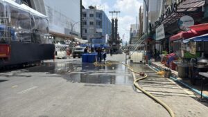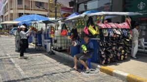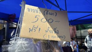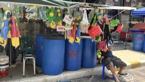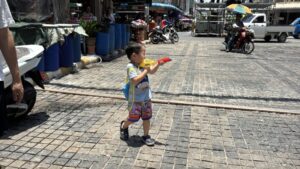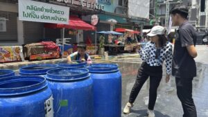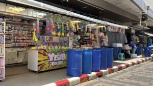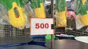 ด้าน น.ส.พัชราภรณ์ ไพรีรณ แม่ค้าจำหน่ายอุปกรณ์เล่นน้ำสงกรานต์ เปิดเผยว่า ภายในร้านมีการจำหน่ายสินค้าหลากหลาย ทั้งปืนฉีดน้ำ แป้งสี อุปกรณ์กันน้ำสำหรับโทรศัพท์ รวมถึงเครื่องดื่มและน้ำแข็ง โดยปืนฉีดน้ำสำหรับเด็กมีราคาเริ่มต้นประมาณ 89 บาท ขณะที่แป้งสีจำหน่ายเป็นชุดในราคาประมาณ 50 บาท