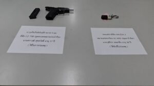 เมื่อเวลา 11.00 น. วันที่ 11 เม.ย. 69 พ.ต.อ.ธงรบ แจ้งจิต รอง ผบก.จ.ปทุมธานี, พ.ต.อ.จรินทร์ อธิบธานนท์ ผกก.สภ.ธัญบุรี, พ.ต.ท.ธวัชชัย รัตนพาหุ รอง ผกก.สส.สภ.ธัญบุรี, พ.ต.ท.สุนทร สุขหน้าไม้ สว.สส.สภ.ธัญบุรี พร้อมเจ้าหน้าที่ตำรวจสืบสวน สภ.ธัญบุรี ได้ร่วมกันจับกุม นายไกรวุฒิ หรือเอฟ จอมกลิ่น อายุ 33 ปี (สวมเสื้อลายสก๊อต คนขับรถเก๋งและเป็นคนยิง) นายศราวุฒิ หรือวุฒิ สุขสวัสดิ์ อายุ 17 ปี (คนซ้อนท้ายรถ จยย. และคนยิงซ้ำ) นายญาณภัทร หรือเบียร์ รุ่งเรืองอนุกูล อายุ 17 ปี (สวมเสื้อเทา คนขับรถ จยย.) พร้อมของกลาง รถยนต์เก๋ง ยี่ห้อมาสด้า 2 สีเทา หมายเลขทะเบียน กธ 3495 ปทุมธานี รถจักรยานยนต์ ยี่ห้อฮอนด้าหลีด สีดำ ไม่ติดแผ่นป้ายทะเบียน อาวุธปืนกึ่งอัตโนมัติ ยี่ห้อ CZ 75B สีดำ ขนาด 9 มม. จำนวน 1 กระบอก
