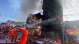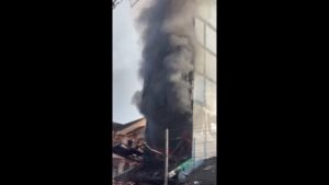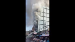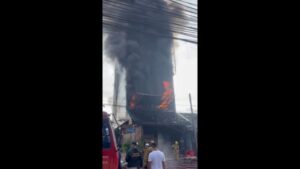 ที่เกิดเหตุพบเป็นอาคารพาณิชย์สูง 6 ชั้น เปิดเป็นร้านจำหน่ายสีรถยนต์ เพลิงลุกไหม้อย่างรุนแรง เปลวไฟโหมพุ่งออกจากตัวอาคาร พร้อมกลุ่มควันสีดำหนาทึบลอยปกคลุม มองเห็นได้จากระยะไกล