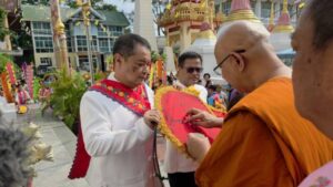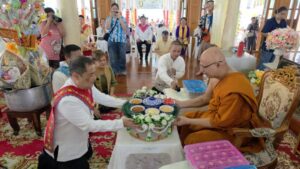 ผู้ว่าฯ ปทุมธานี นำพุทธศาสนิกชนร่วมพิธีแห่หงส์ธงตะขาบ และห่มผ้าเจดีย์ทรงรามัญคู่ ณ วัดบางหลวง พร้อมถวายข้าวแช่เปิบสำรับคาวหวาน รับศิริมงคลสงกรานต์ปี 2569