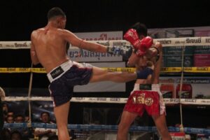 คู่ที่ 2. พลิกชนะเข้ารอบ 8 คน ไทยแลนด์ ส.รุ่งศักดิ์ (แดง) พบกับ ยอดเพชร พี.เค.เสี่ยต้อม ที.เค.อะไหล่ยนต์ (น้ำเงิน) คู่นี้ใครแพ้ตกรอบผู้ขนะเข้ารอบ 8 คนทันทีมวยซ้ายด้วยกัน ไทนแลนด์ เดินเข้าหาเตะขาหน้าตามด้วยหมัด ยอดเพชร พยามเตะซ้ายนำแต่ยังวืดวาด พยามเดินจับคอปล้ำในตีเข่าเน้นๆ ไทยแลนด์ ก็โต้ด้วยหมัดเท้าเข่าศอกหน้าหงายไปเหมือนกันได้ชัดเจนทำเอา ยอดเพชร ถึงกับหยุดชะงัดไปทันทีอย่างเห็นได้ชัดครบยก ไทยแลนด์ ชนะคะแนน เข้ารอบ 8คน ส่วน ยอดเพชร ตกรอบ